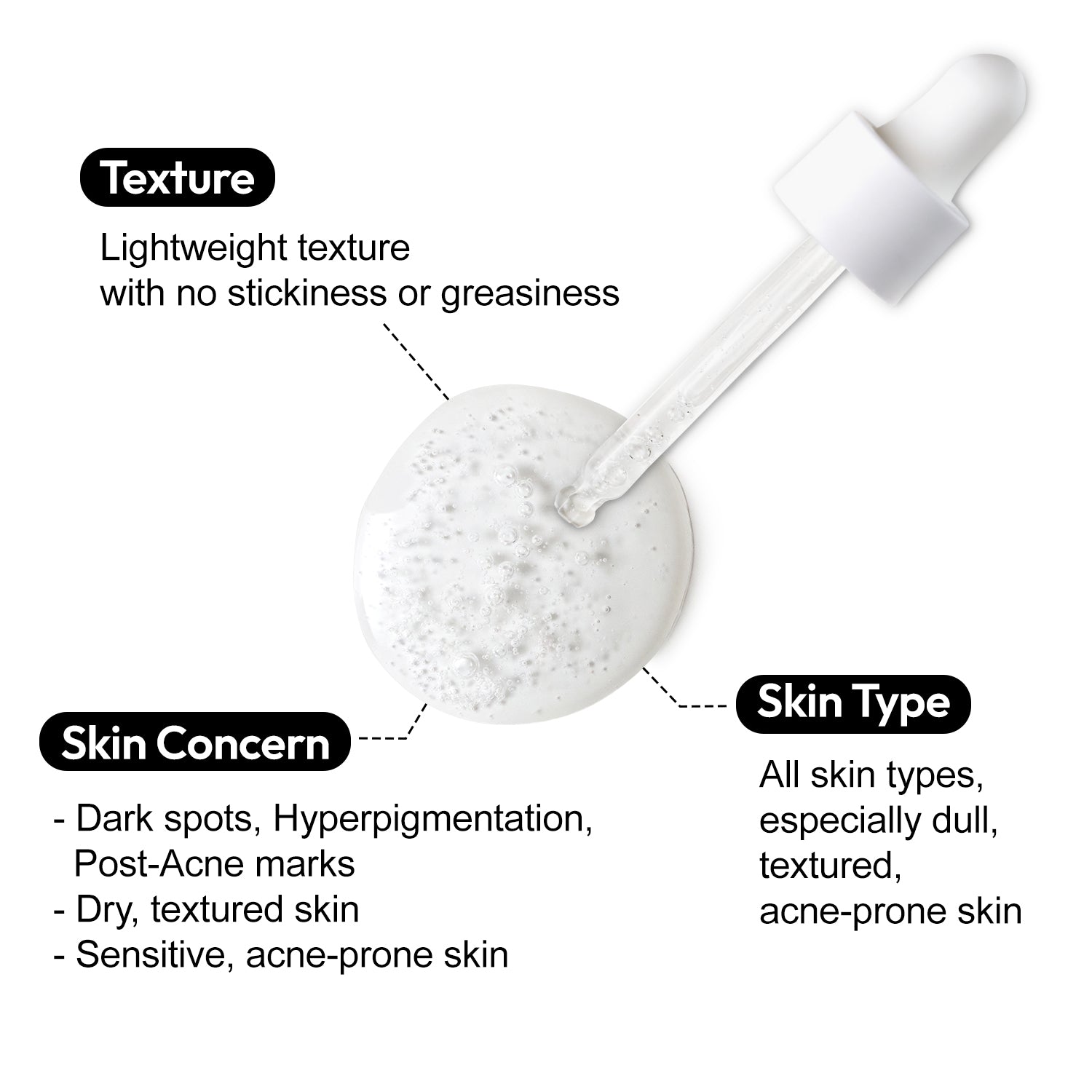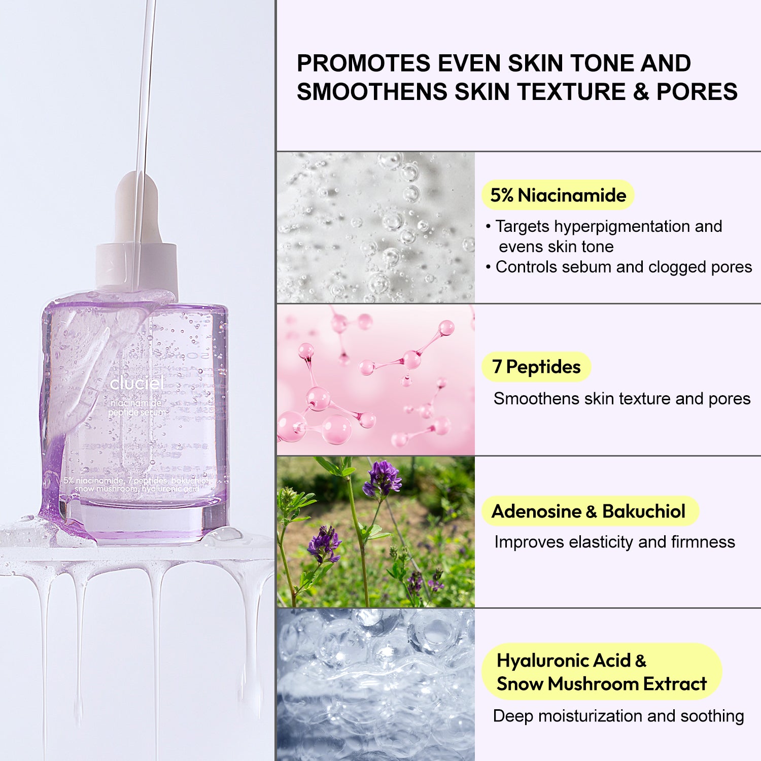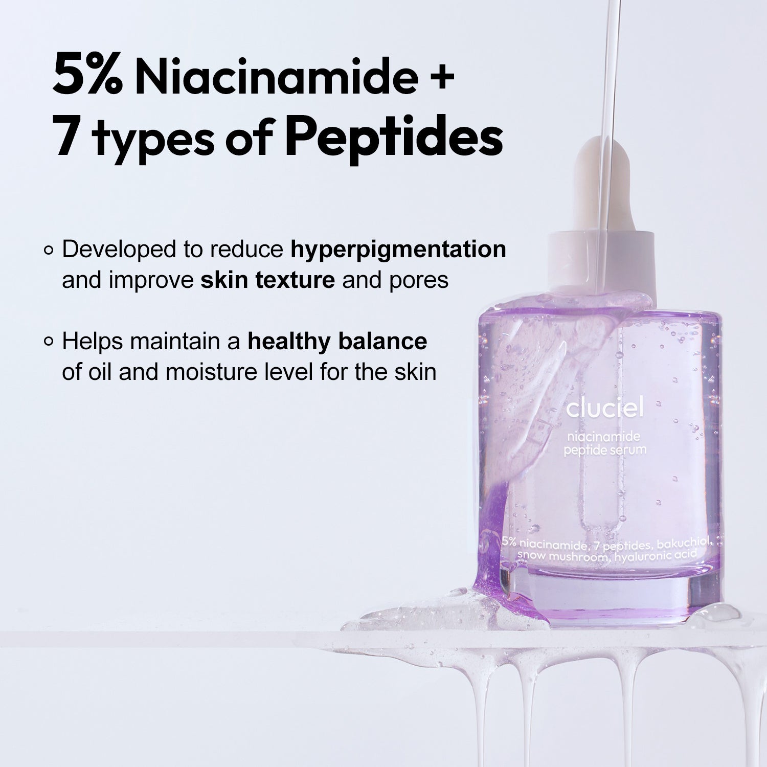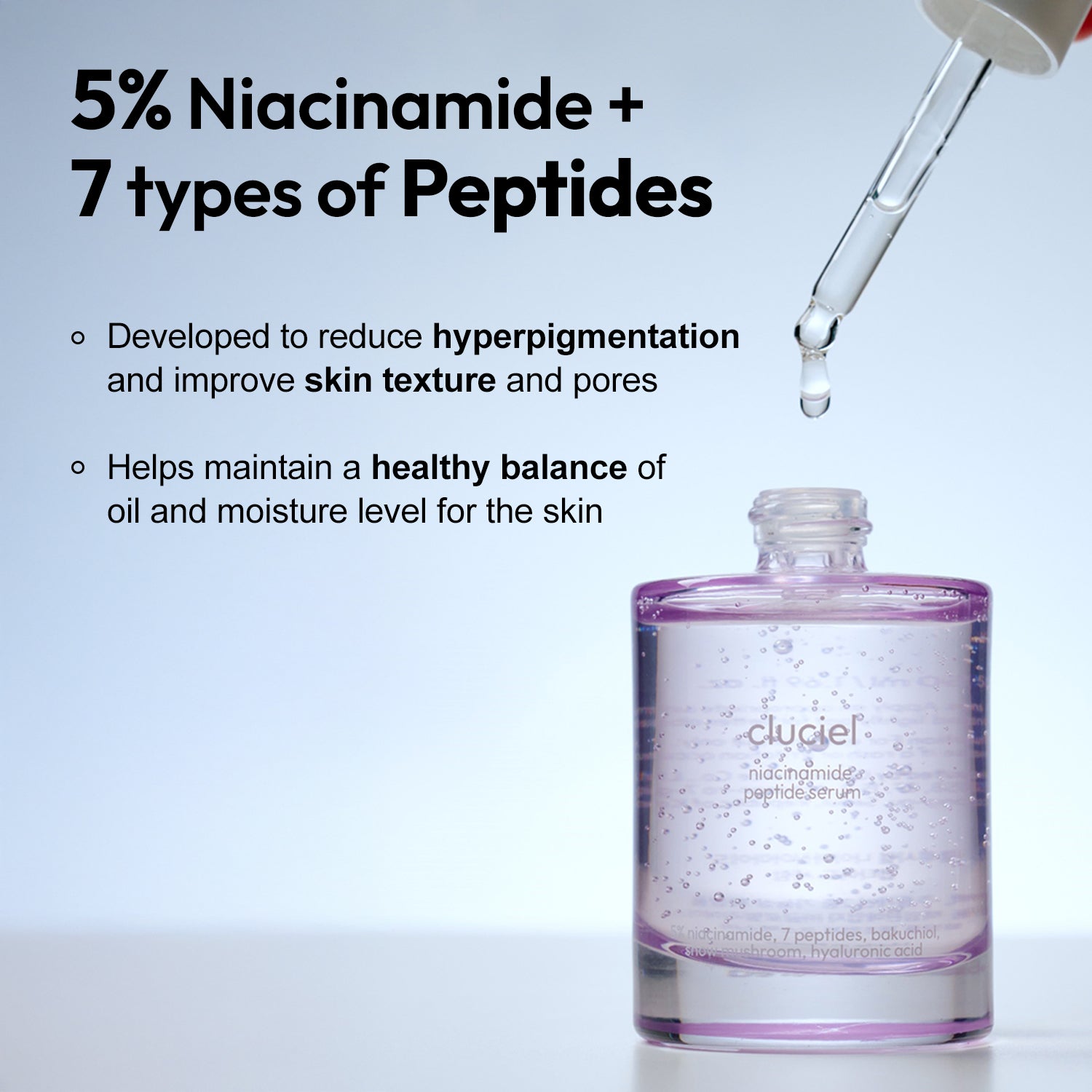 The synergy of 5% niacinamide and 7 types of peptides targets dullness and repairs dark spots. It smoothens skin texture and improves enlarged pores.