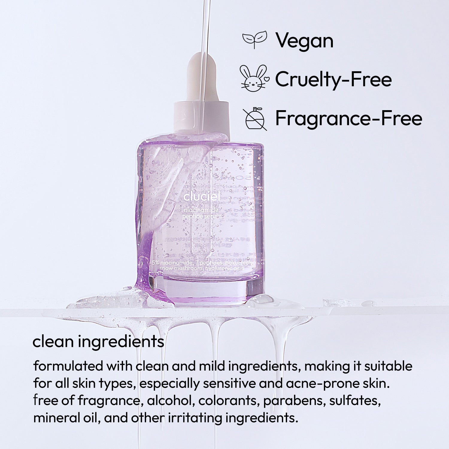 Clean, Vegan, and Cruelty-free. Formulated with clean and mild ingredients, it is suitable for all skin types, especially sensitive and acne-prone skin. Free of fragrance, alcohol, colorants, parabens, sulfates, mineral oil, and other irritating ingredients.