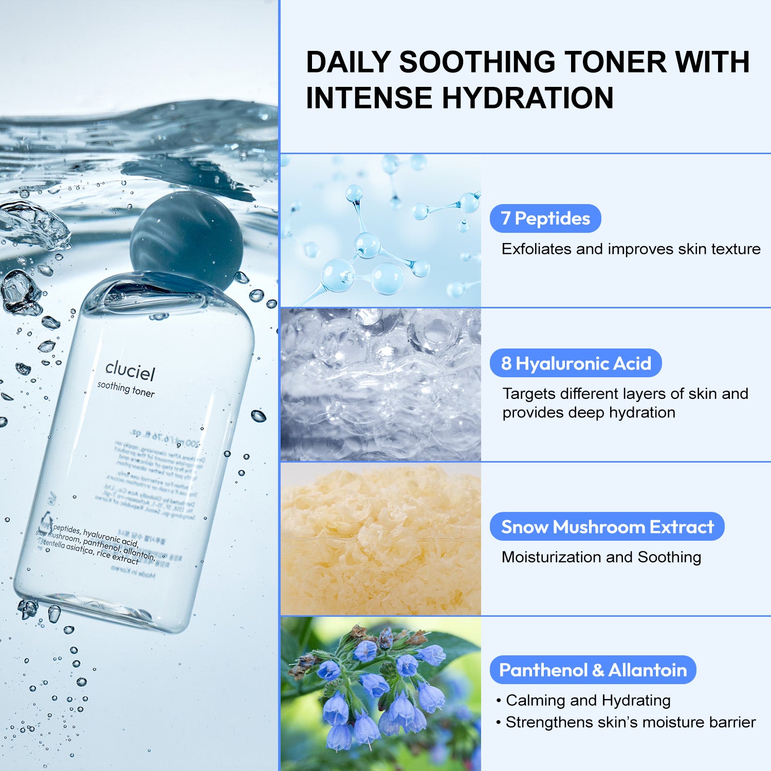 Light watery toner that soothes and calms skin. The star ingredients penetrate deep into the skin and deliver intense hydration that moisturizes the skin.